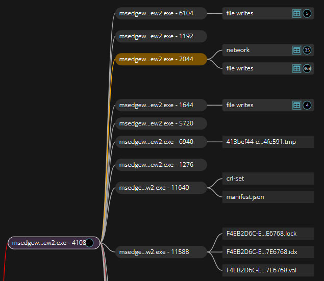 Switching to the Forensics interface and opening the Storytime graph for the alert we can see part of one of the process trees we are interested in (Figure 9). This shows that the “olk.exe“ process spawned an instance of “msedgewebview2.exe” (PID 4108) which eventually triggered the alert. That isn’t the ”msedgewebview2.exe” process we identified earlier in our investigation so we need to dig further.