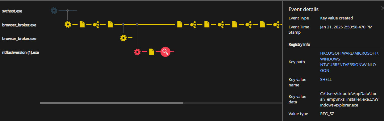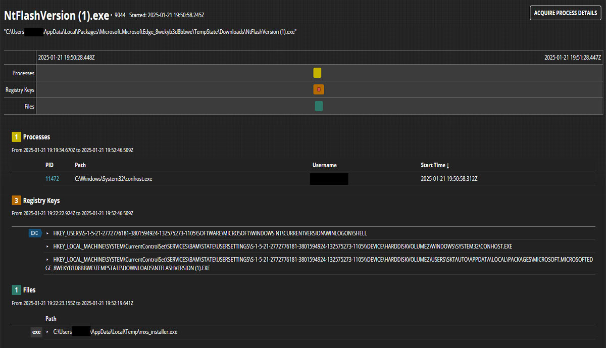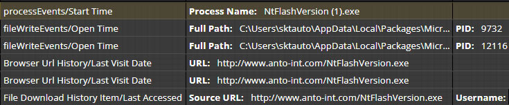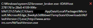 Looking at the alert we can see that the “browser_broker.exe” process spawned “NtFlashVersion (1).exe” which triggered the alert. A quick search on the internet shows that the “browser_broker.exe” process is part of the Edge browser and will spawn downloaded executables [2]. That said, we can assume that “NtFlashVersion (1).exe” was downloaded from Edge and then run by the user. The sibling process’s command line, another instance of “browser_broker.exe”, shows both the downloaded path and the source URL of the executable (Figure 6).