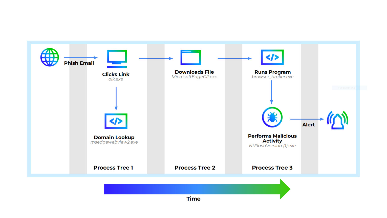 This scenario, adapted from MITRE’s Turla evaluation, shows how a successful phishing attack can be investigated using EDR with Forensics. The attack plays out as shown in Figure 2. The victim receives a phish email with a malicious link. They are then tricked into downloading and running a fake installer. When launched, it drops an embedded executable and modifies the registry to run it on logon.