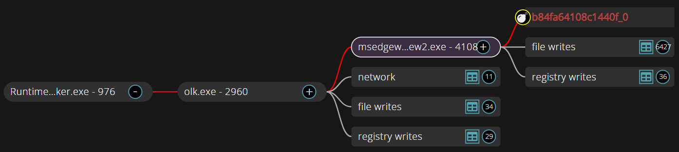 Fully expanding the graph (Figure 10), we can see the process that performed the DNS lookup was a child of the “msedgewebview2.exe” (PID 4108) process shown in the collapsed view. We can also see that the grandparent process is “olk.exe” (PID 2960), which is related to the Microsoft Outlook email client [3].