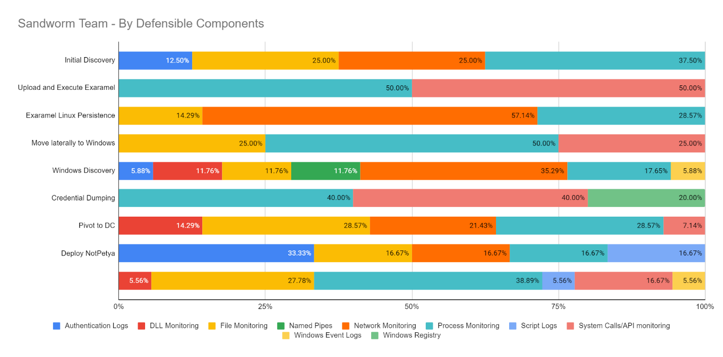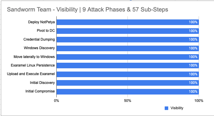 | Sandworm Team | Across 9 attack Phases comprised of 57 sub-steps | 100% 57 of 57 sub-steps |