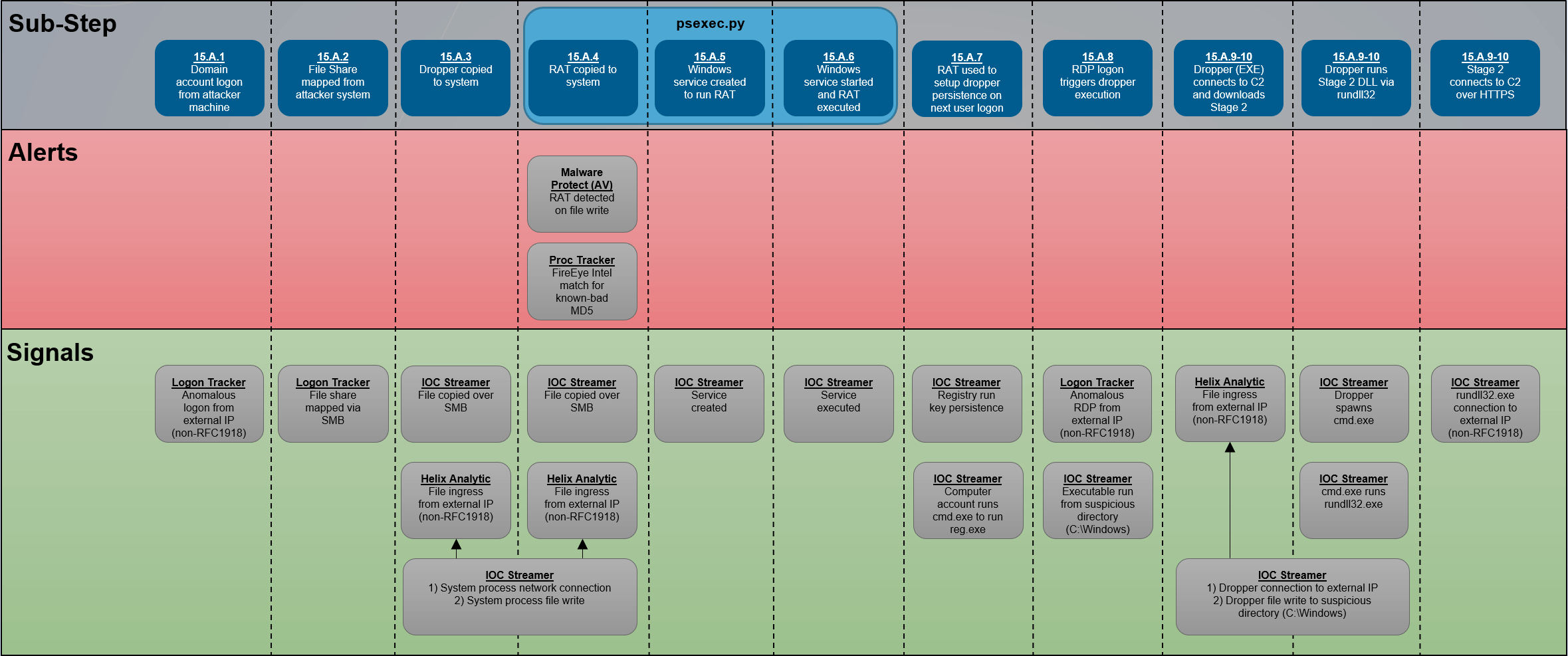 To understand how we approached this problem it’s useful to visualize how we define alerts vs. signals. To do so we’ll use Step 15 of this year’s evaluation which consisted of lateral movement, persistence, and execution (among other tactics). The diagram below provides a brief overview of each sub-step and for each sub-step, the alerts, and signals that we collected during the evaluation. Note that this activity occurred on a single host.
