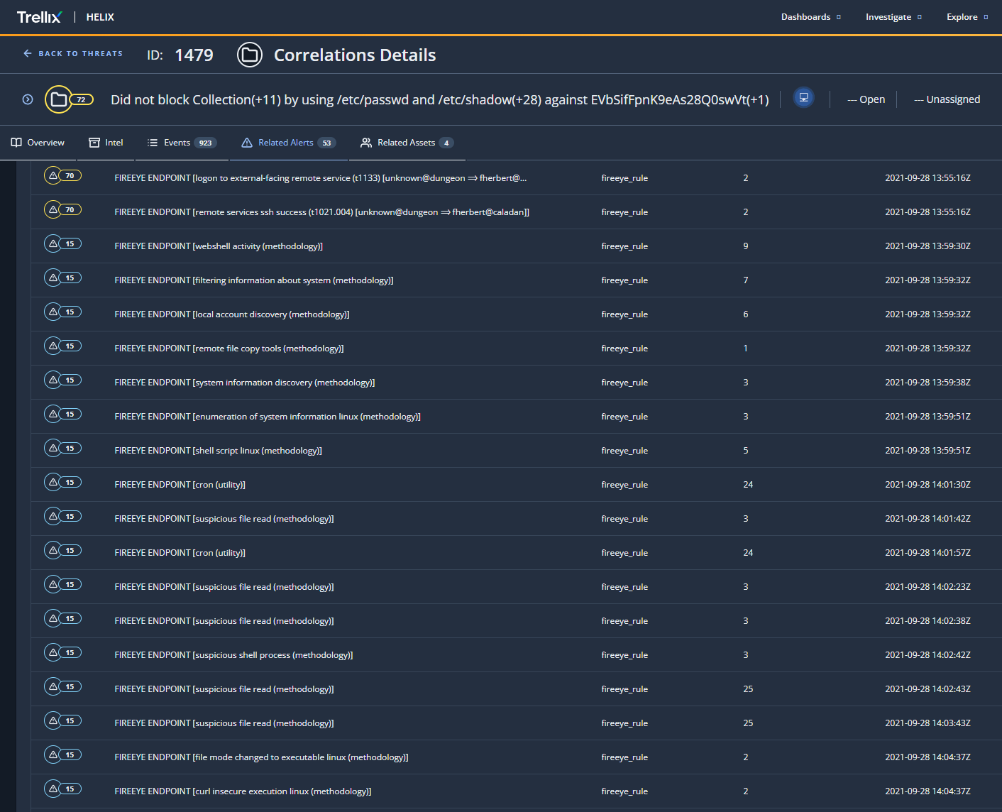 Another advancement in our product line leading up to this year’s evaluation was the development of Helix Threats. Helix Threats is a new feature in Helix that correlates alerts and presents them in the form of contextualized threats. While Helix Threats is a beta feature that didn’t stop us from using it in last year’s evaluation. The screen shot below shows activity on a Linux system that includes lateral movement to the Linux system, deployment of a web shell, system discovery via the webshell, deployment of a second implant, credential harvesting, and persistence (Steps 11-14 in the evaluation).