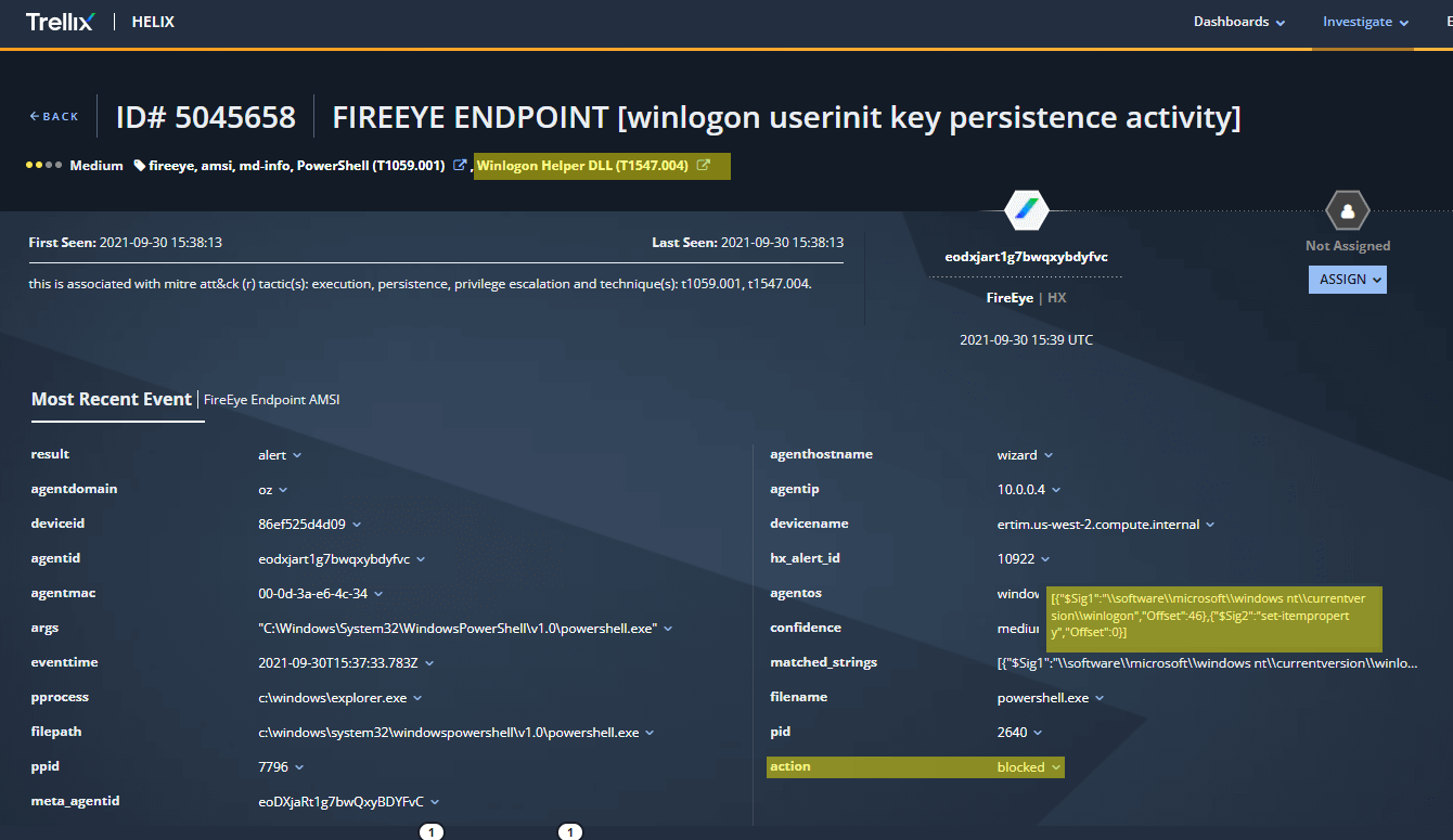 The screenshot below shows the presentation in Helix of the AMSI block discussed previously. Note the references to the Winlogon Helper DLL (T1547.004) technique, the action of “blocked” (leading to a medium severity alert instead of a high severity alert), and the snippet of the PowerShell script pertaining to the detection (displayed on mouse-over of the “matched strings” field).