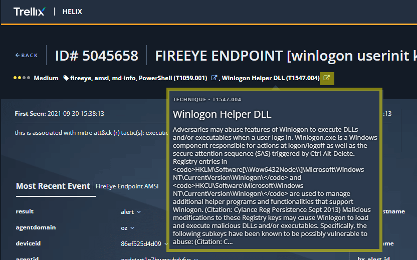 In addition, mousing-over the Winlogon Helper DLL (T1547.004) technique provides a pop-up with the MITRE ATT&CK technique description, enabling the analyst to get the full ATT&CK technique context without leaving the Helix console.