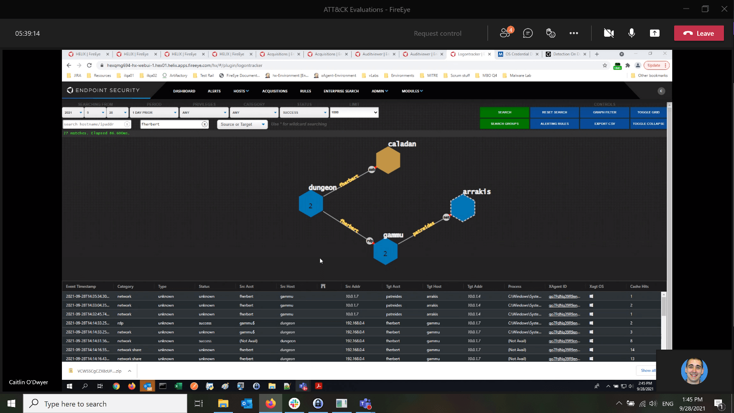 The screenshot below from the Logon Tracker UI shows the attacker moving from the attacker system (dungeon) using the valid account “fherbert”. The arrow pointing to the Linux system (caladan) indicates an SSH connection while the arrow pointing to the Windows systems (gammu) indicates an RDP connection. Lastly, the attacker also authenticated with the Domain Controller (arrakis) using the account “patreides”, designated by a NET connection below.