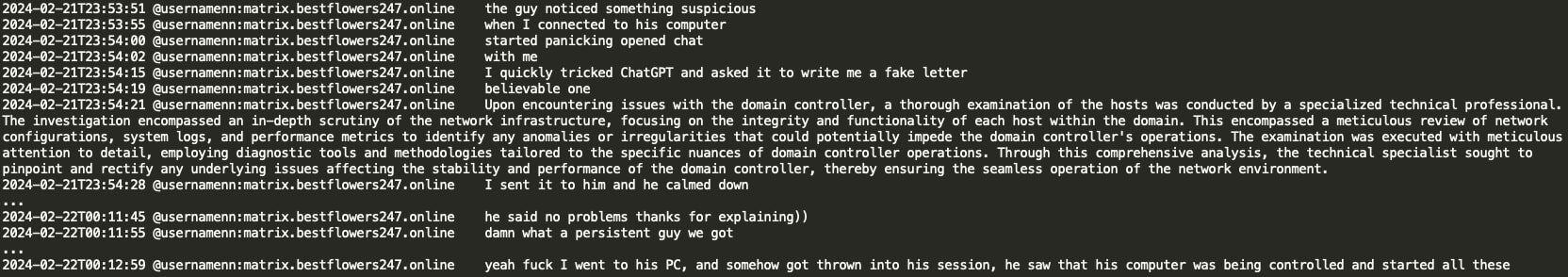 In this instance, NN inadvertently logged into an active user PC on the victim organization's network, alerting the user of a remote login within their current session. NN utilizes ChatGPT to rapidly generate a deceptive message, falsely asserting that a professional network check is underway and assuring the user that there is no cause for concern.