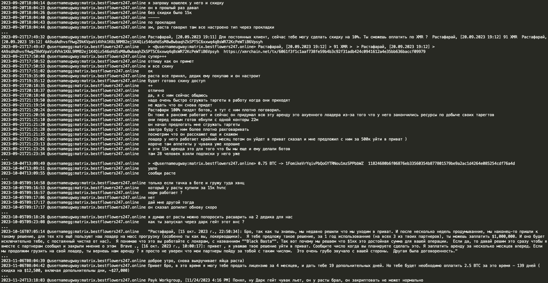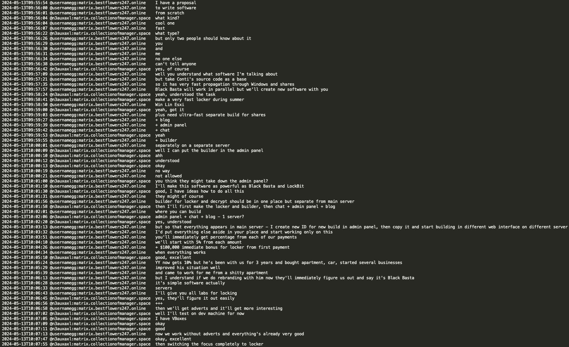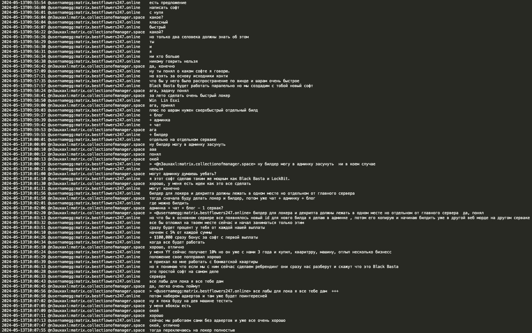 On Feb 11, 2025 a Telegram user @ExploitWhispers shared via their Telegram channel ‘shopotbasta’ (EN: ‘basta whisper’) Black Basta RaaS (Ransomware as a Service) Matrix chat leaks containing over 200,000 messages spanning from September 2023 to September 2024. The @ExploitWhispers claim that Black Basta has recently attacked Russian banks and thus crossed the line, therefore they decided to leak their internal chat communications.