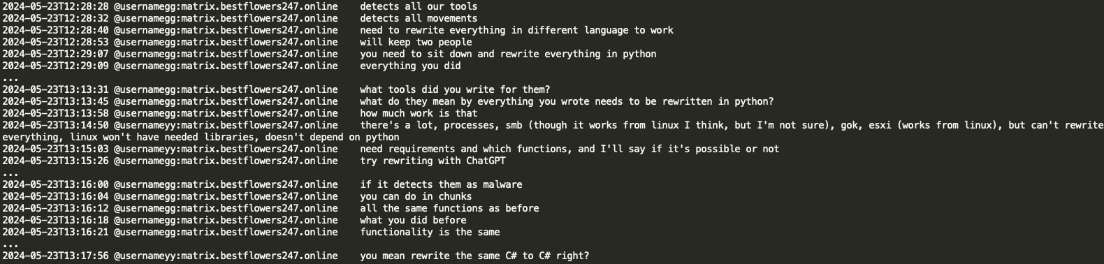 YY (coder of Black Basta) was instructed to rewrite the tools in Python as some of the gang’s malware got detected by AV/EDR. GG asked YY to use ChatGPT for that, and if ChatGPT would complain about malware, YY can instead provide code in chunks. YY later inquired if GG's suggestion was to rewrite C# in C#, revealing that Tramp instructed to rewrite the malware from C# to Python using ChatGPT.