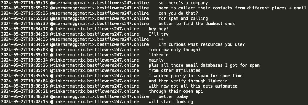 Here GG requested that Tinker (negotiator) gather victim company contacts and emails from various sources for the purpose of spamming and calling. GG inquired about the resources Tinker utilizes, to which Tinker responded that he uses an email database for spamming, verifies contacts via LinkedIn, and that with the new ChatGPT, everything is being automated through their API services.