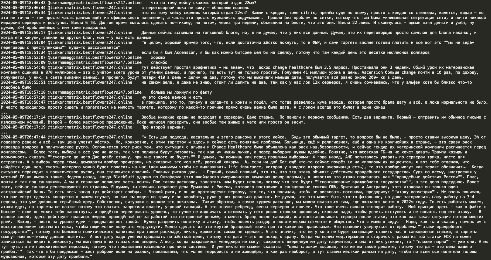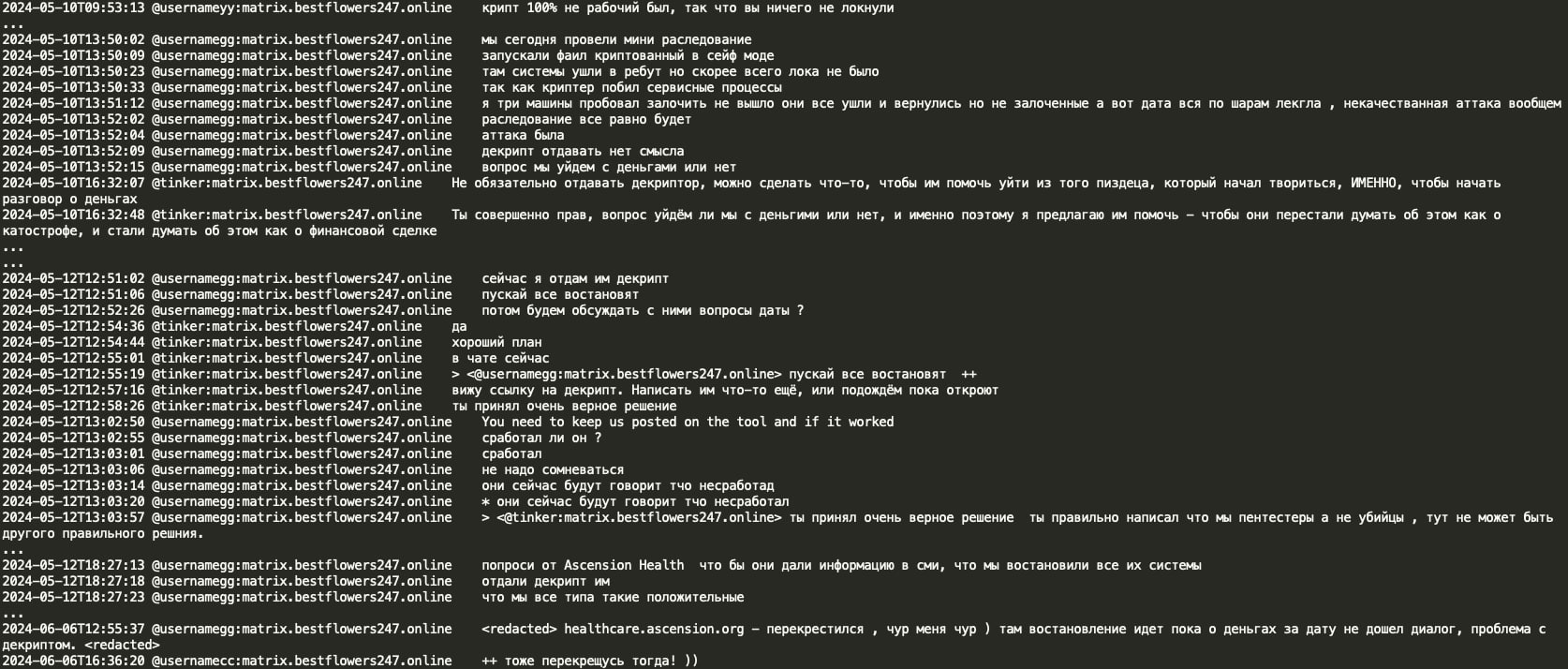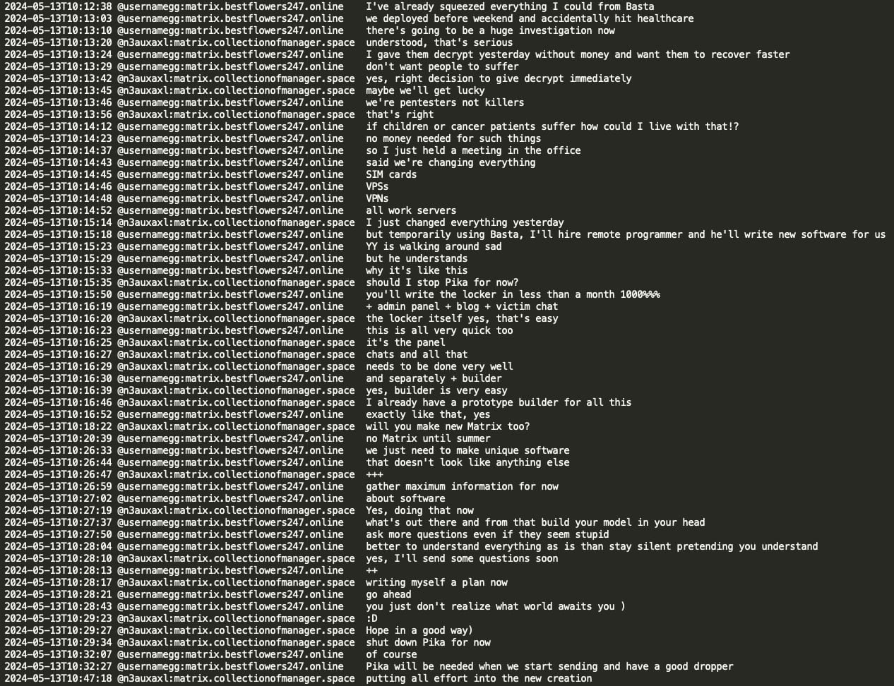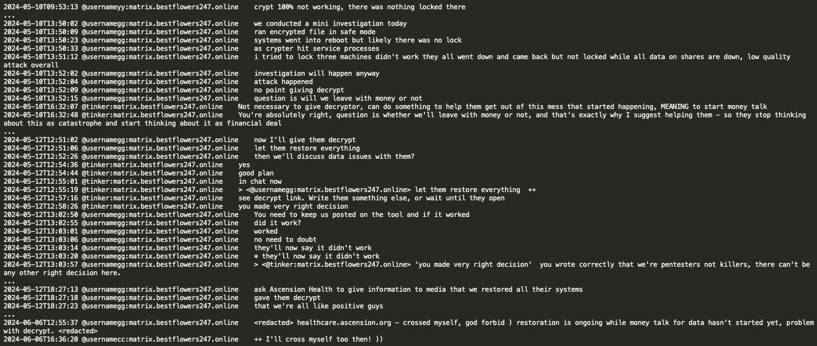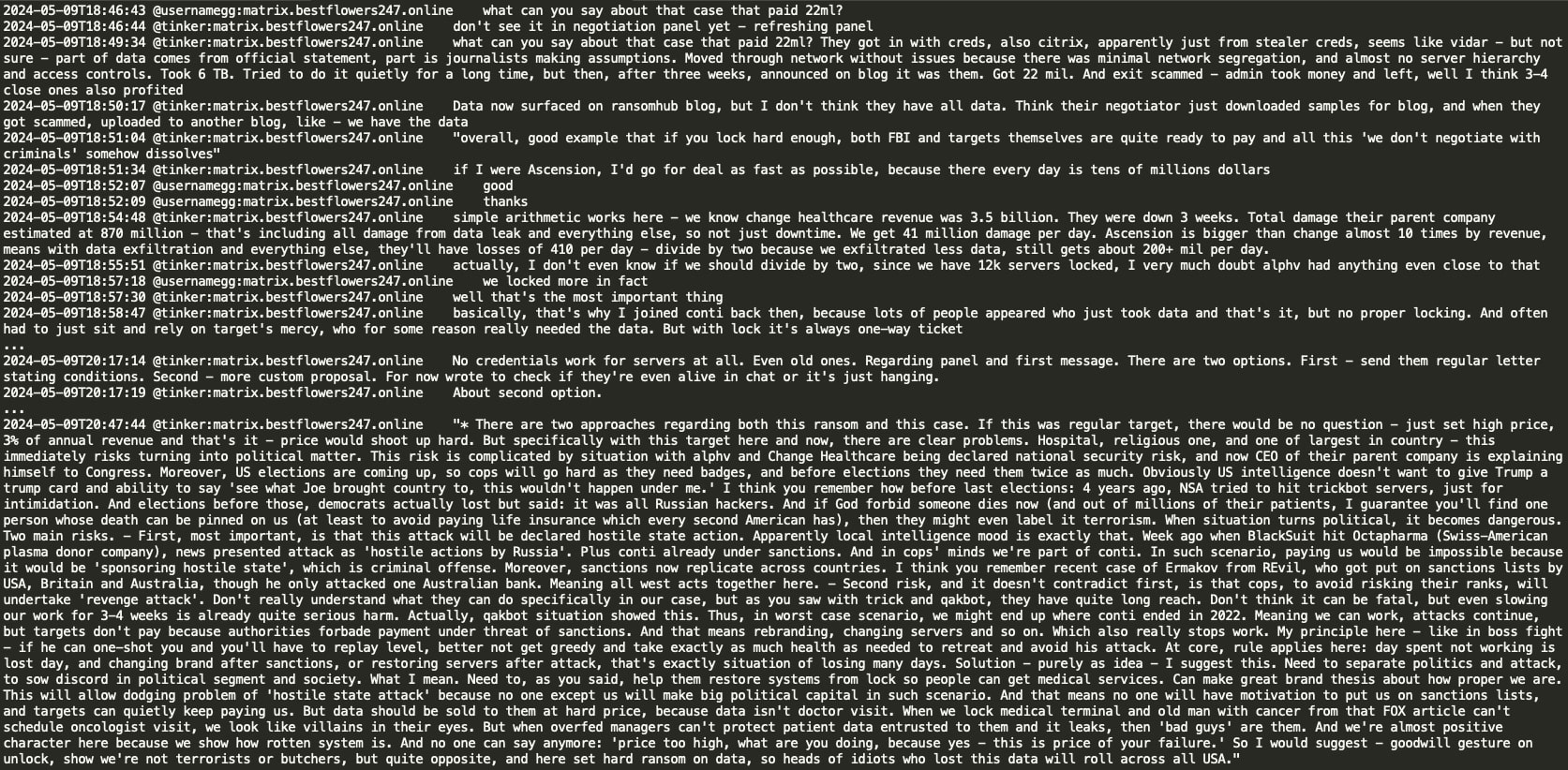 In a notable conversation, threat actors Tinker and GG discussed the Ascension Health data breach and compared it to the Change Healthcare incident perpetrated by the ALPHV RaaS operation, where Change Healthcare allegedly paid a $22 million ransom. The Black Basta group discovered that they had not encrypted the Ascension Healthcare data correctly due to a crypt error and decided to share the decryption key to avoid potential political sanctions and retaliation from US law enforcement against their infrastructure. However, they planned to demand a ransom for the exfiltrated patient data from Ascension Health.
