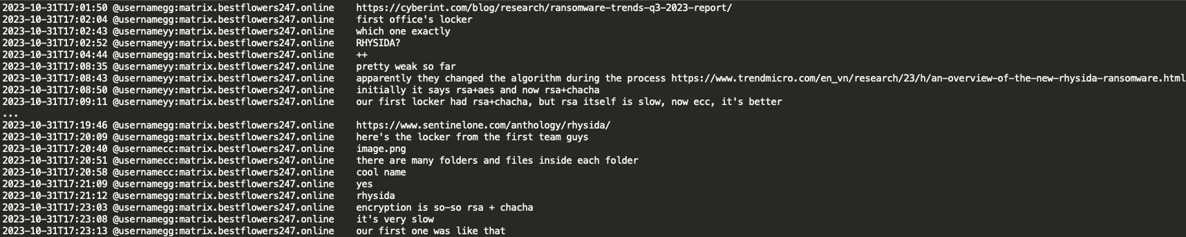 The first office/team appears to have its own locker - Rhysida ransomware. Black Basta gang members discussed that it is still weak and the encryption used (RSA + ChaCha20) resembles the first version of the Black Basta ransomware.