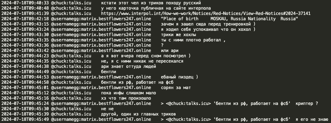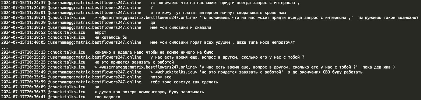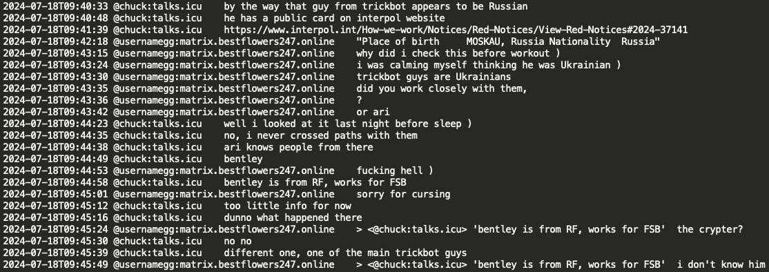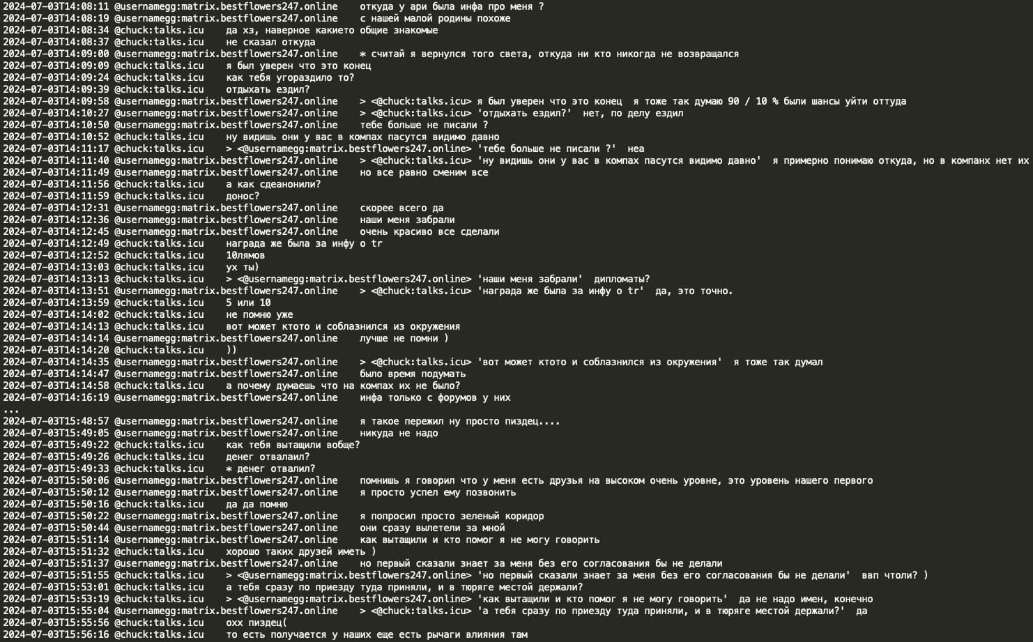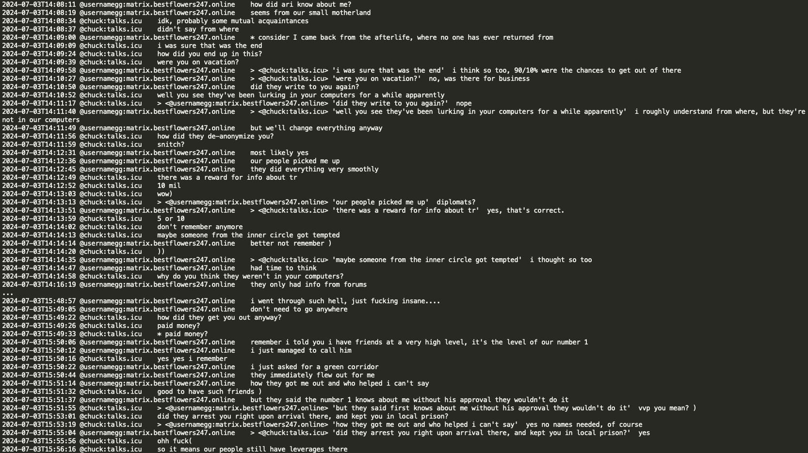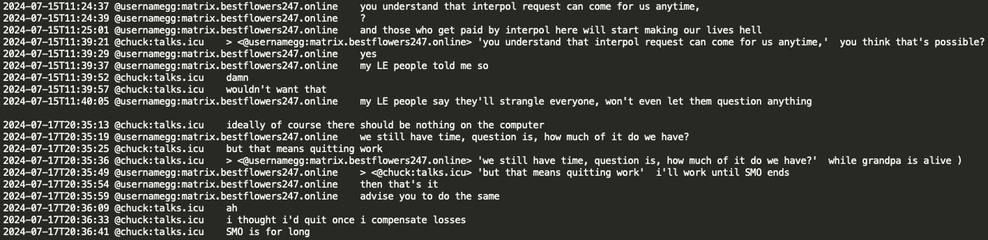 Analysis of the chat leaks showed that GG sent no message from June 20, 2024 until July 3, 2024. When GG resumed activity in the Matrix chat, he had a lengthy conversation with Chuck discussing the circumstances surrounding his arrest and how Russian authorities helped him. GG stated that he contacted Russian authorities and requested a ‘green corridor’ and they promptly flew to extricate him. GG implies he has friends at the very high level, the level of the number 1 and the number 1 was aware of his situation and his rescue would not have been possible without his coordination. Chuck asked if the number 1 is ‘vvp’ (potentially V.V. Putin) however received no confirmation or denial.