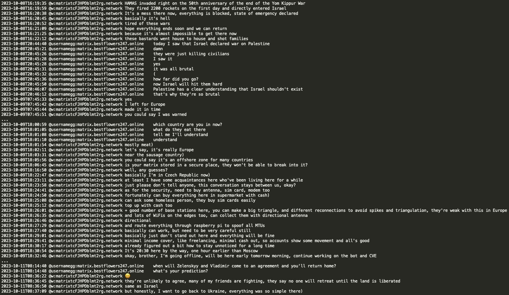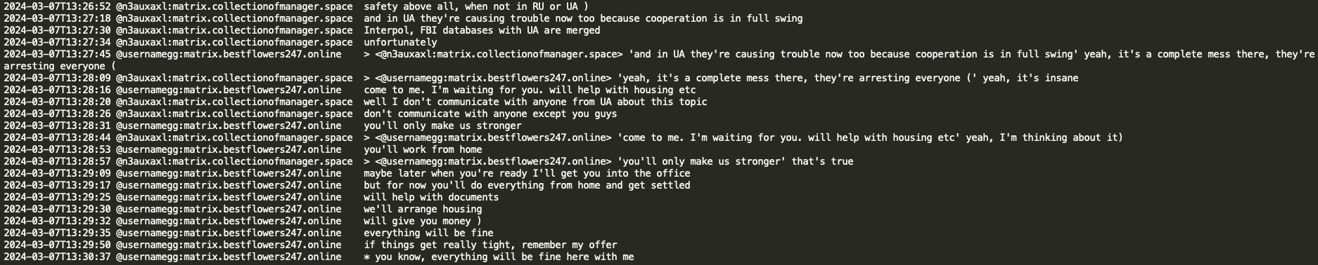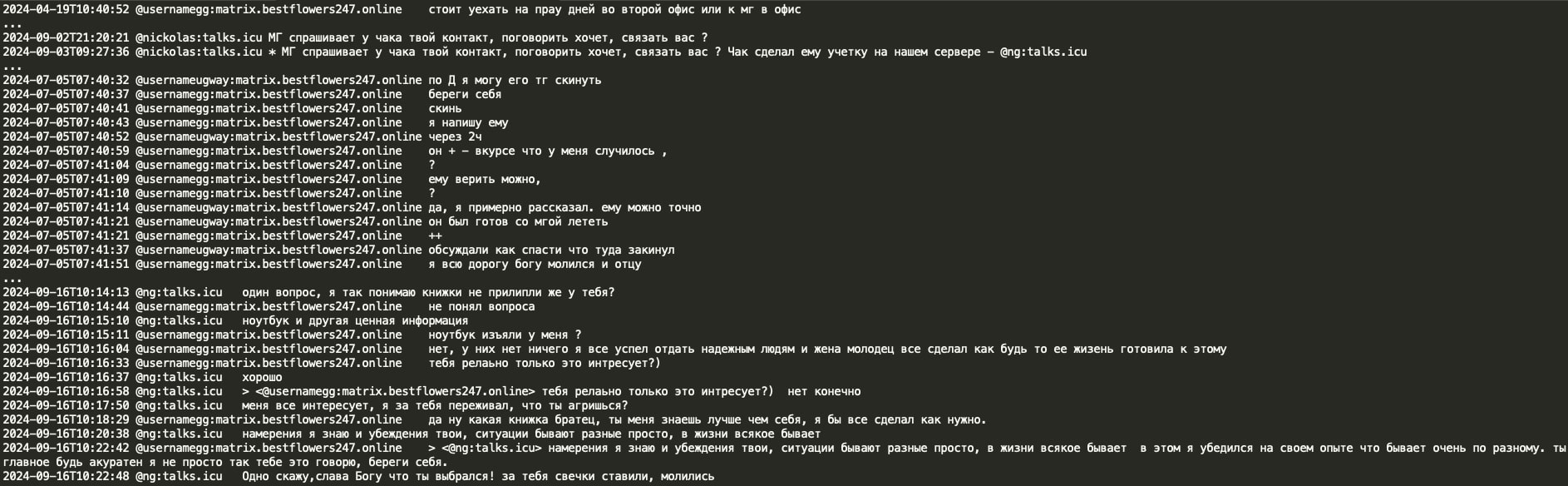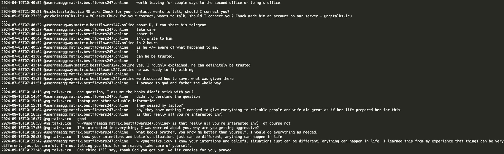 Analysis of the chat leaks showed that GG sent no message from June 20, 2024 until July 3, 2024. When GG resumed activity in the Matrix chat, he had a lengthy conversation with Chuck discussing the circumstances surrounding his arrest and how Russian authorities helped him. GG stated that he contacted Russian authorities and requested a ‘green corridor’ and they promptly flew to extricate him. GG implies he has friends at the very high level, the level of the number 1 and the number 1 was aware of his situation and his rescue would not have been possible without his coordination. Chuck asked if the number 1 is ‘vvp’ (potentially V.V. Putin) however received no confirmation or denial.