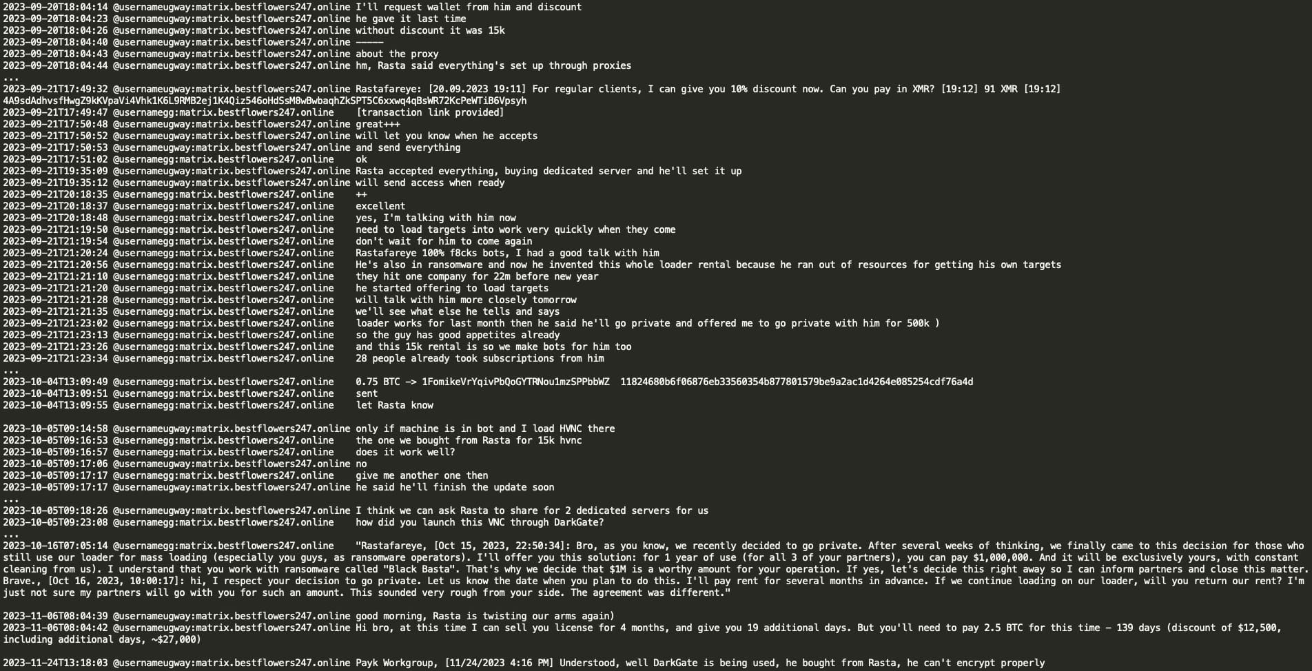 It appears that Black Basta had rented the DarkGate loader and HVNC from threat actor ‘Rastafareye’. Ugway (spammer) had direct communication with Rastafareye and negotiated discounts, rental terms, and other technical aspects of the DarkGate/HVNC malware. Ugway mentioned that Rastafareye was involved in the ransomware business himself, in addition to malware rentals. Rastafareye expressed a desire to go private, stating that he had enough subscribers (28 people), and offered $1M for a year of exclusive use of their loader. Ugway informed ‘Rasta’ that they would rent the loader for several months in advance.