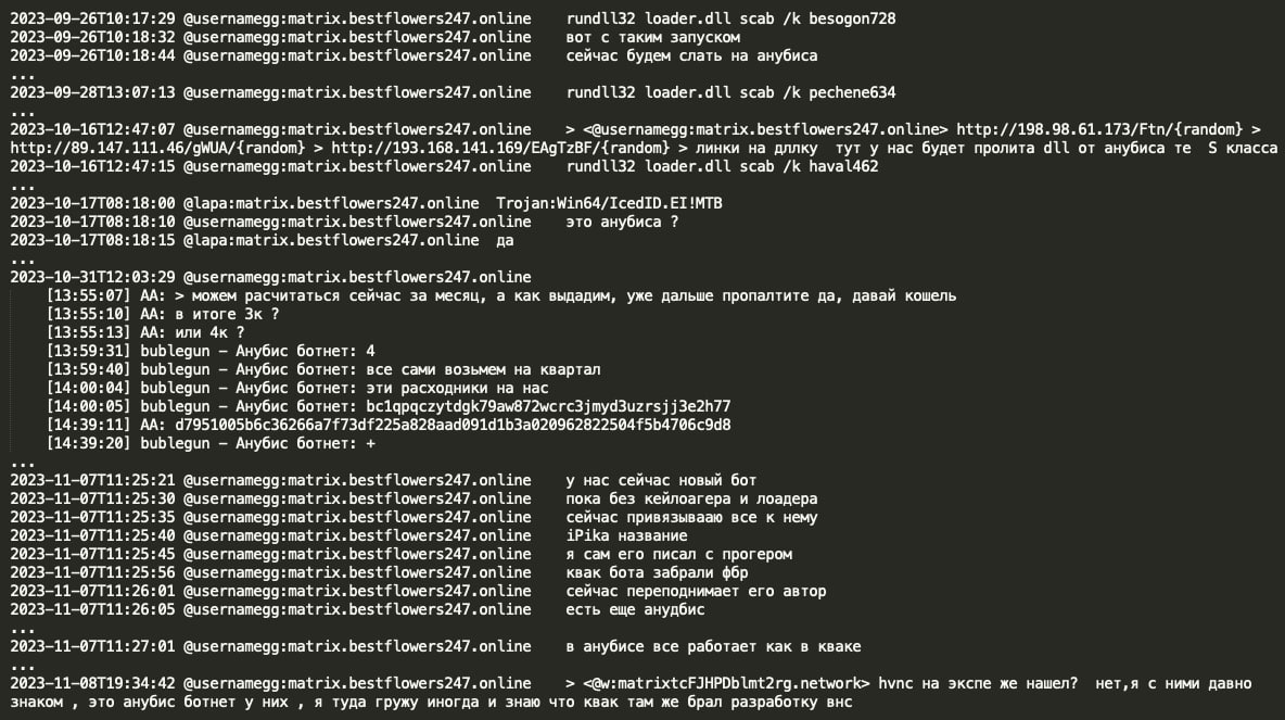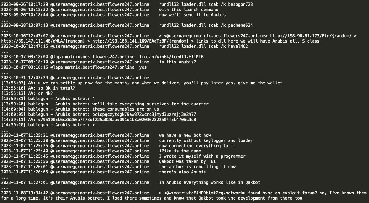 Furthermore, examination of Black Basta chats reveals their utilization of IcedID malware in their attack campaigns. IcedID malware which is believed to be created by Conti RaaS coder Leo appears to be leased by Black Basta gang, internally referred to as Anubis loader/botnet. Based on the signature identifier ‘Trojan:Win64/IcedID.EI!MTB’ and loader’s execution using rundll32.exe with function scab /k accompanied by arguments such as besogon728 or pechene634 or haval462, it can be inferred that the Anubis botnet is in fact IcedID malware. It seems that one month of IcedID rental incurred a cost of $4,000 USD for Black Basta group. GG indicated a longstanding familiarity with the Anubis team, noting Anubis' operational similarities to Qakbot and suggesting Qakbot's VNC development originated from Anubis malware.