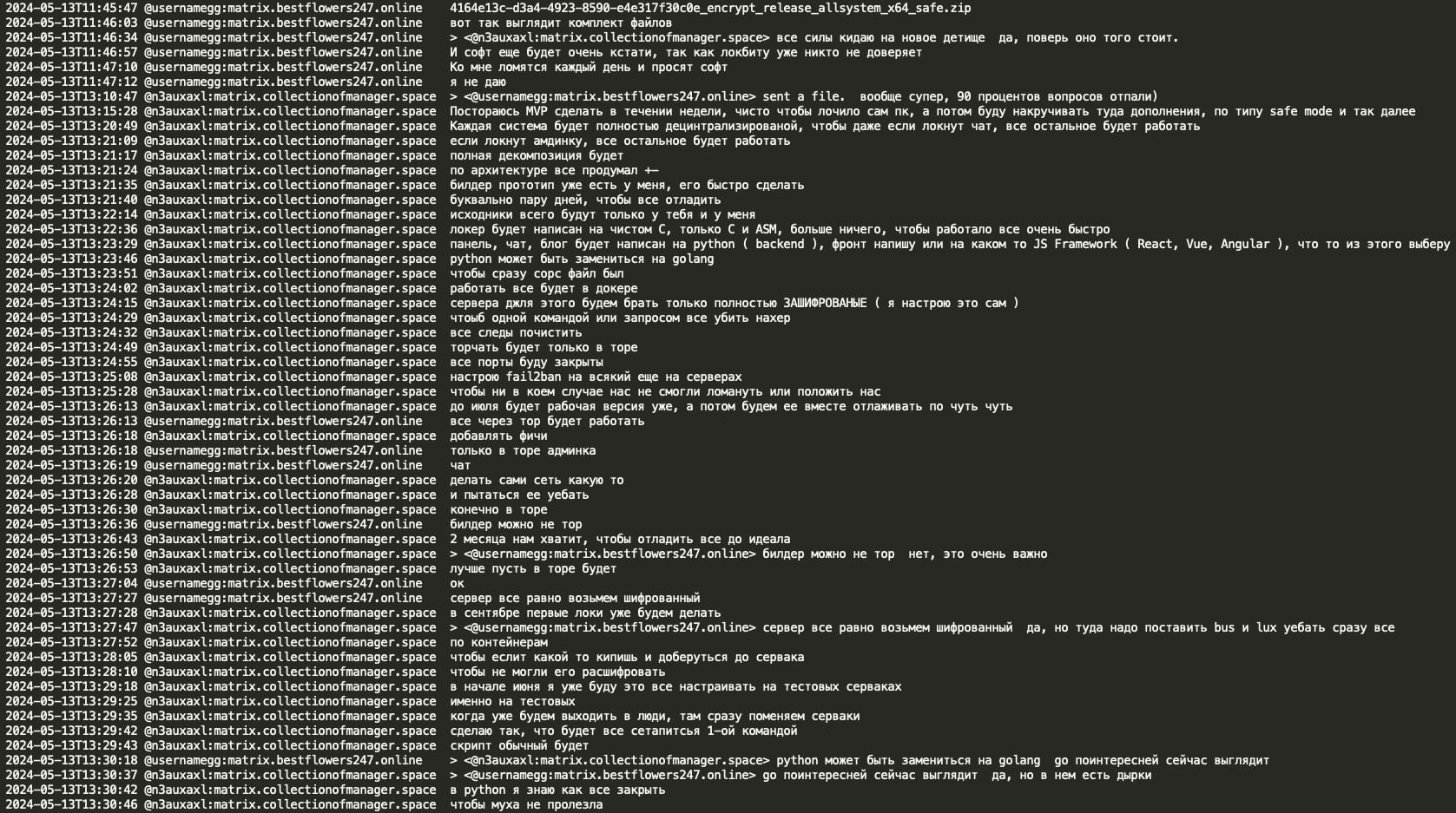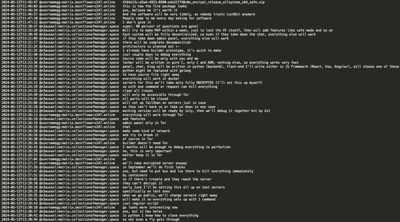 Mecor shared the prototype of a new RaaS in great detail – a sophisticated new ransomware locker written in C and ASM featuring a fully decentralized architecture with separate components for the locker, admin panel, chat, and blog, all operating through Tor with encrypted servers and Docker containerization for quick termination if compromised. The planned timeline indicates development of an MVP for PC locking by June 2024, with full debugging by July, and first deployments targeted for September 2024, while emphasizing security measures like fail2ban, closed ports, and complete system decomposition to ensure operational continuity even if individual components are compromised.