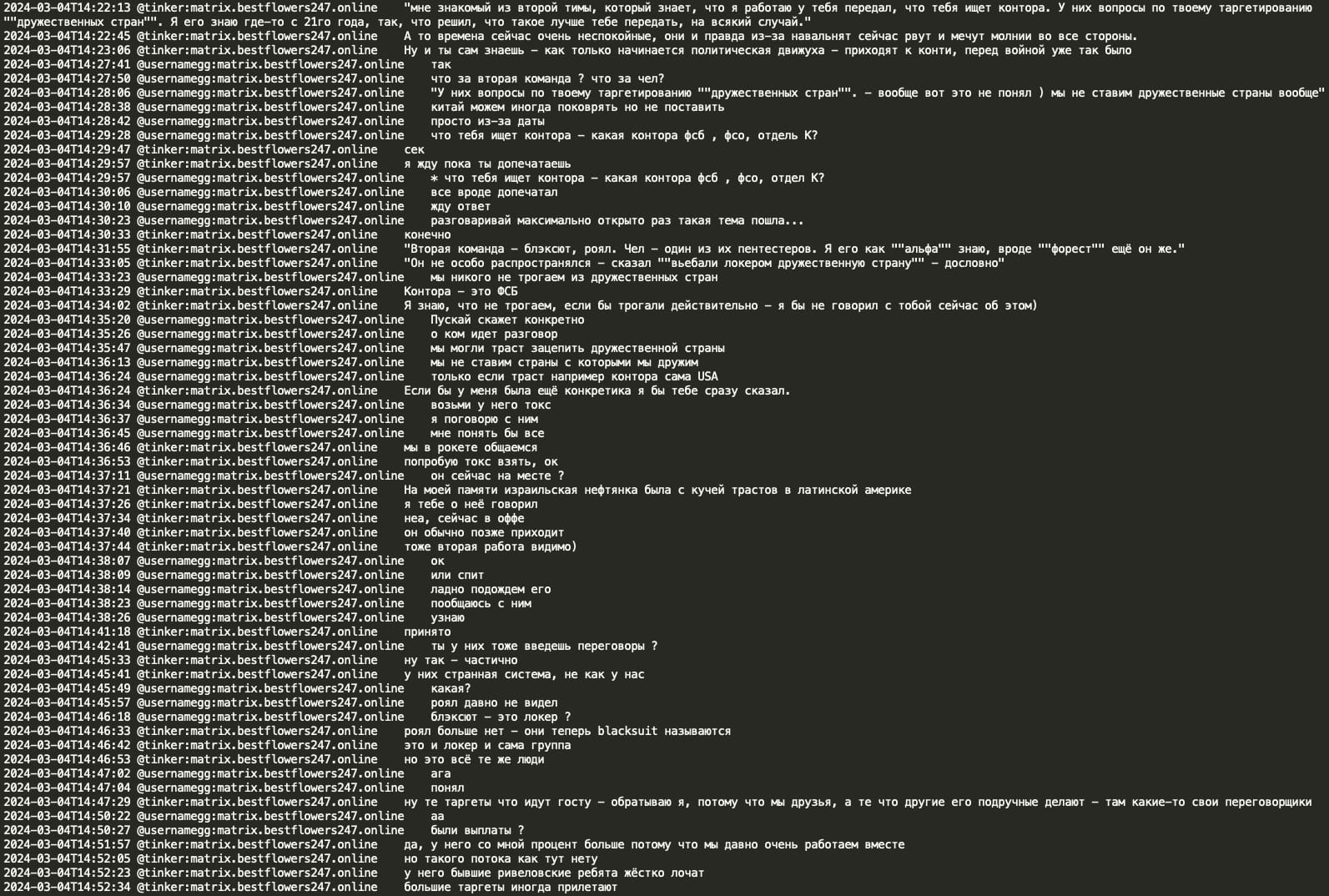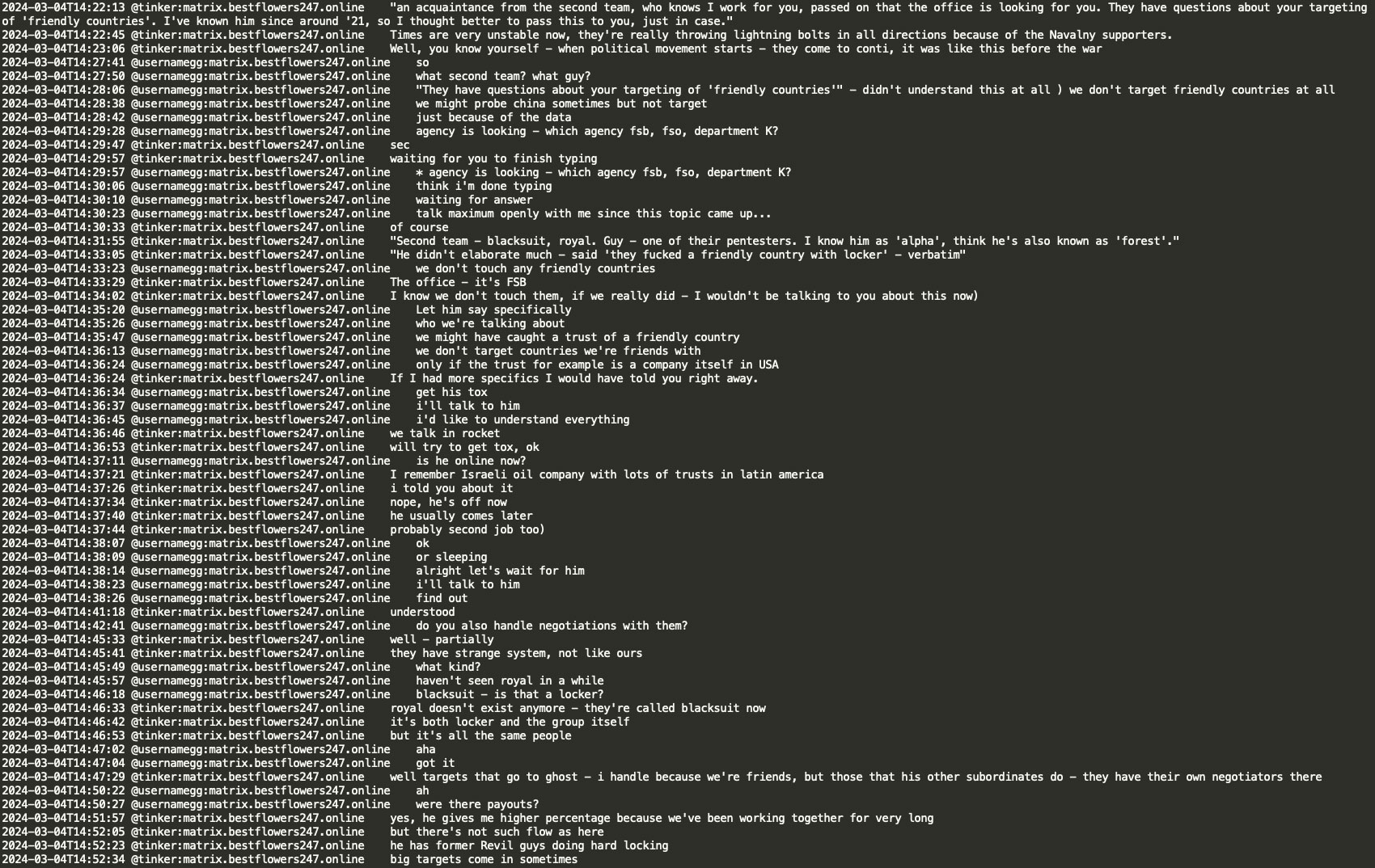 In March 2024, Tinker (a negotiator and Conti member) informed GG that a pentester ‘alpha’ (also known as ‘forest’) from the BlackSuit/Royal ransomware group (a Conti spinoff), inquired about GG's targeting of ‘friendly countries’. Due to an attack linked to Black Basta RaaS, ‘the office’ was searching for him. GG responded by asking ‘which office - the FSB, FSO, or the department K?’ (FSB: Federal Security Service, FSO: Federal Protective Service, Department K: Federal Internal Affairs department handling IT/cybercrime). Tinker revealed the office was the FSB. GG clarified that they do not target friendly countries, stating, ‘we occasionally probe China but never lock anything there’. Tinker suggested the situation might be related to an Israeli oil company with numerous trusts in Latin America and provided TOX contact for further discussion. Tinker also mentioned working as a negotiator for BlackSuit RaaS and that former REvil members handle the ‘locking’ (encrypting PCs, network) there.