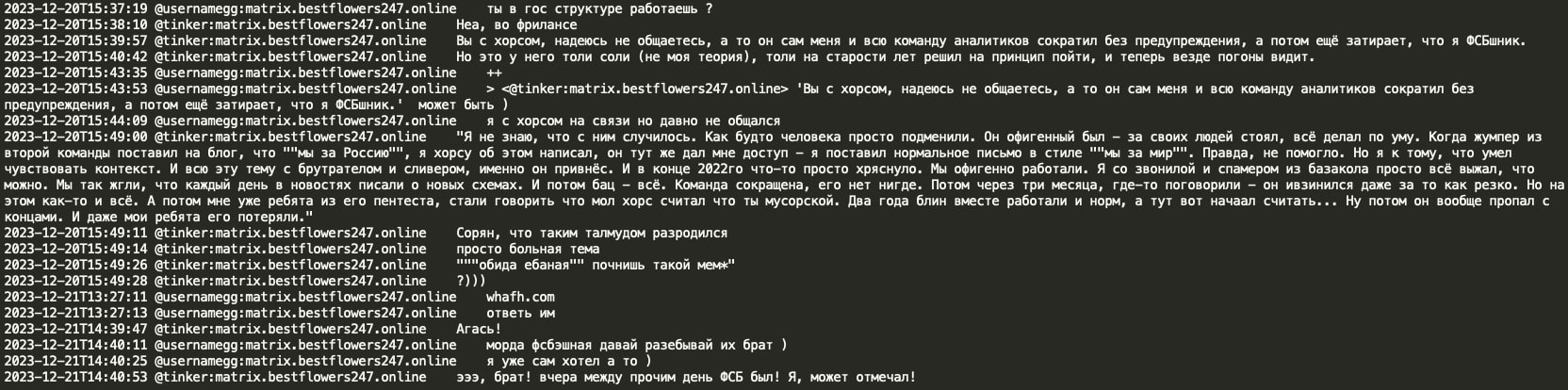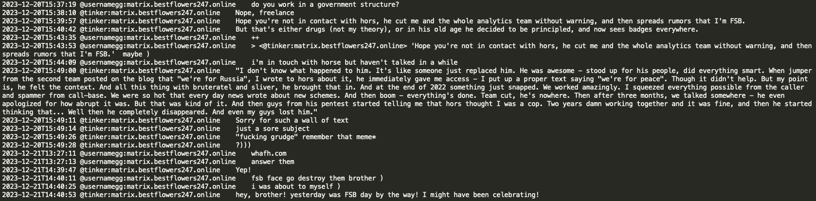 Tinker also indicated that he had previously worked for Hors's team (Conti's leader/sysadmin). Tinker mentions that he does freelance work as a second job and that he lost contact with Hors because Hors believed he worked for the FSB. Tinker advises that this is not the case, although he joked that the previous day was a ‘day of the FSB’ and they may have celebrated it. Interestingly, Tinker mentions that while working for Hors, ‘jumper’ from the second team posted ‘We are pro Russia’ on the blog, and Tinker was the one who then edited the text to ‘We are for peace’, though it did not help in the end. This is a potential reference to the Conti blog where, indeed, similar text modifications were observed in 2022.