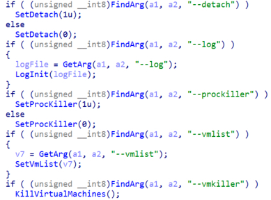 The sixth argument is “--vmlist” which receives a file with a list of names of virtual machines the malware will exclude and not finish its execution. The seventh argument is “--vmkiller” which is responsible for calling the function “KillVIrtualMachines” and is discussed in the next section.