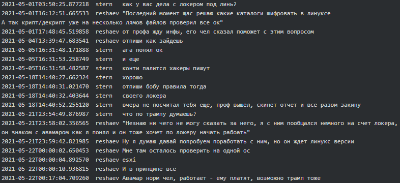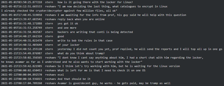 The first mention of a Conti locker for Linux dates to the beginning of May 2021. In the below conversation, the actors’ monikers are marked in bold. Reshaev reports to Stern, he successfully tested the locker and the decryptor against several million files and he is currently applying the final touches to it. “What is left is that I need to check it on one OS, ESXi, and that should be it” said Reshaev, adding that Tramp is already interested to start working with the Linux variant of the ransomware: