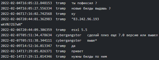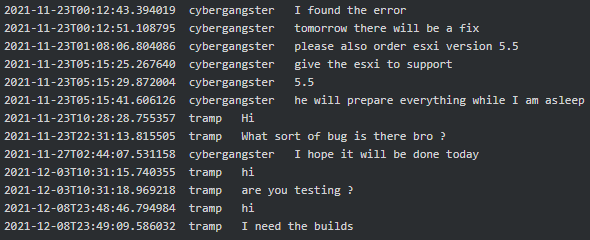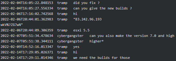 It appears that Conti Linux version had a bug around November 2021. “Throw away the builder I gave you for boby, it [expletive] does not work properly” advised Reshaev to Paranoik. When an error was discovered, Cybergangster said he will fix it by the next day and ordered an ESXi version 5.5 to test and adjust the locker for it. It seems that a fix was still required for the Conti Linux variant up until the beginning of February 2022 and Conti gang kept adjusting it for various ESXi versions including the latest version 7.0 and higher: