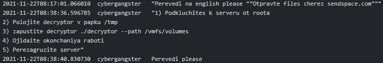 On the 22nd of November 2021 Cybergangster asked Bio to help to translate the Conti Linux variant decryptor instructions which look as follow: