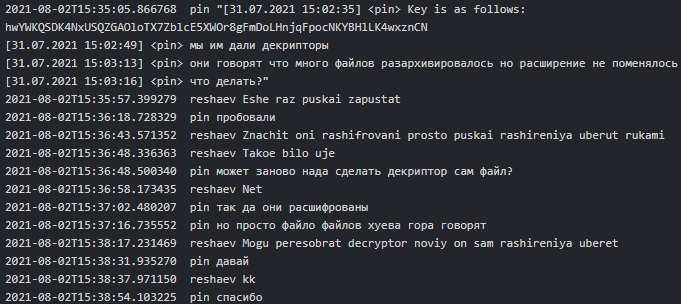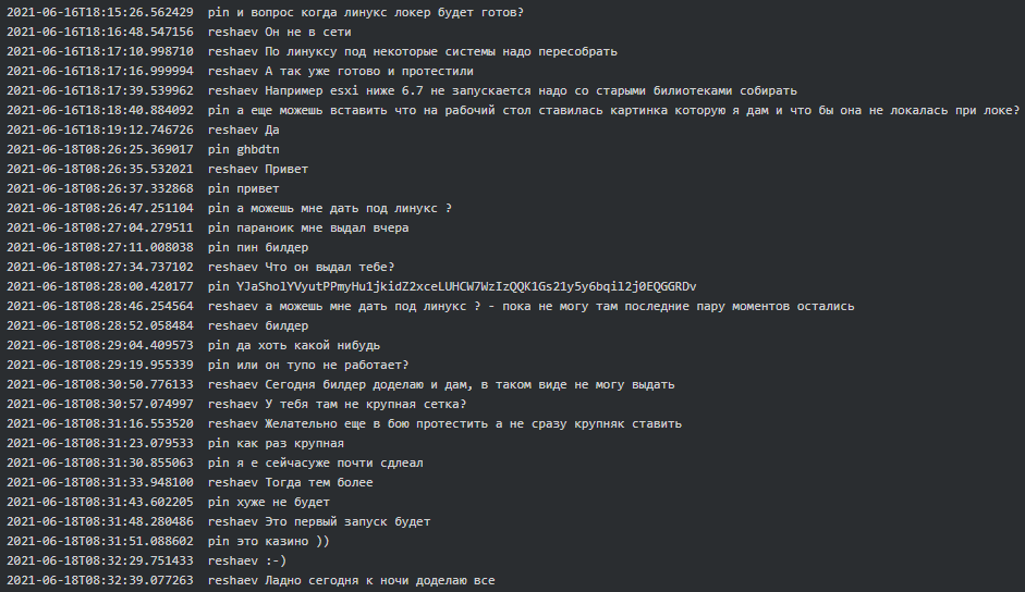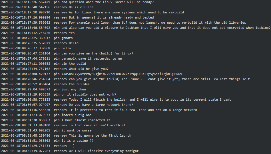 Later in mid-June 2021, Reshaev advised Pin the Linux build of the locker is not ready yet and preferably they should test it on a real case but not a large company. Pin replied to him a large casino hack is almost finalized and suggested giving Reshaev’s Linux locker a try: