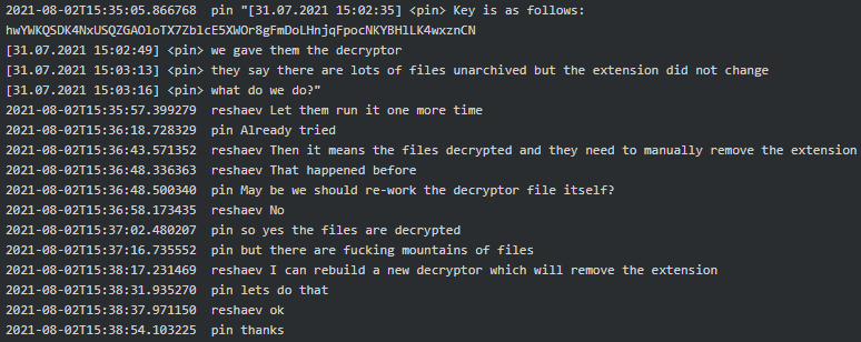 Conti Linux variant decryptor had some issues too. In July-August 2021, Pin reported to Reshaev the provided decryptor did not remove the ransomware extension from the victim’s files. Reshaev first advised the decryptor unlocked the files and the victim just needs to manually change the extension of the files, however due to a large volume of files to process, Pin asked him to rebuild the decryptor so that it automatically removes the extension from the decrypted files: