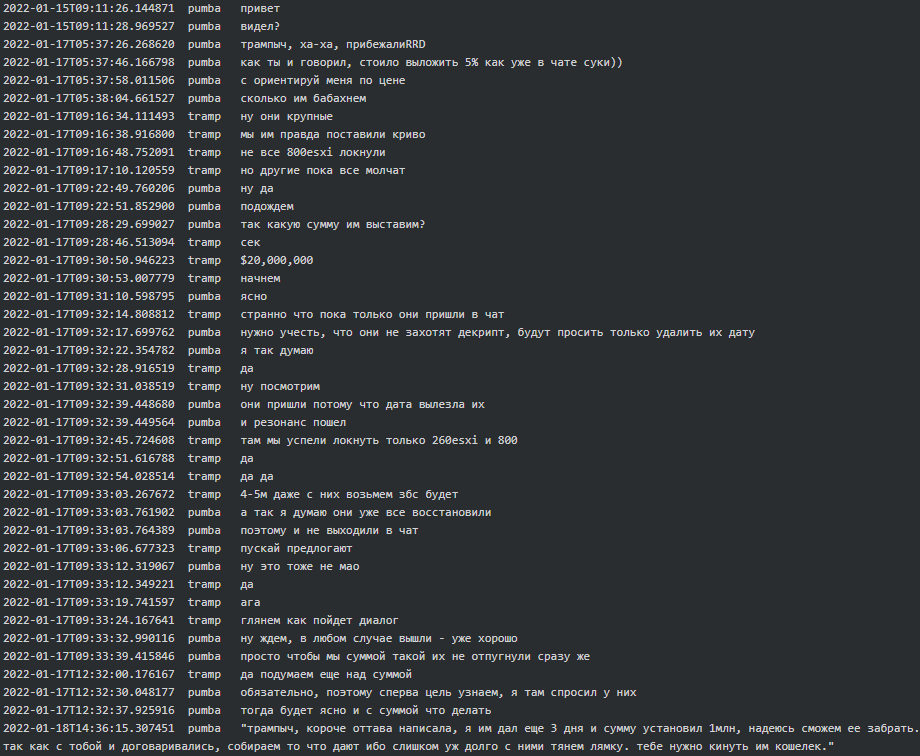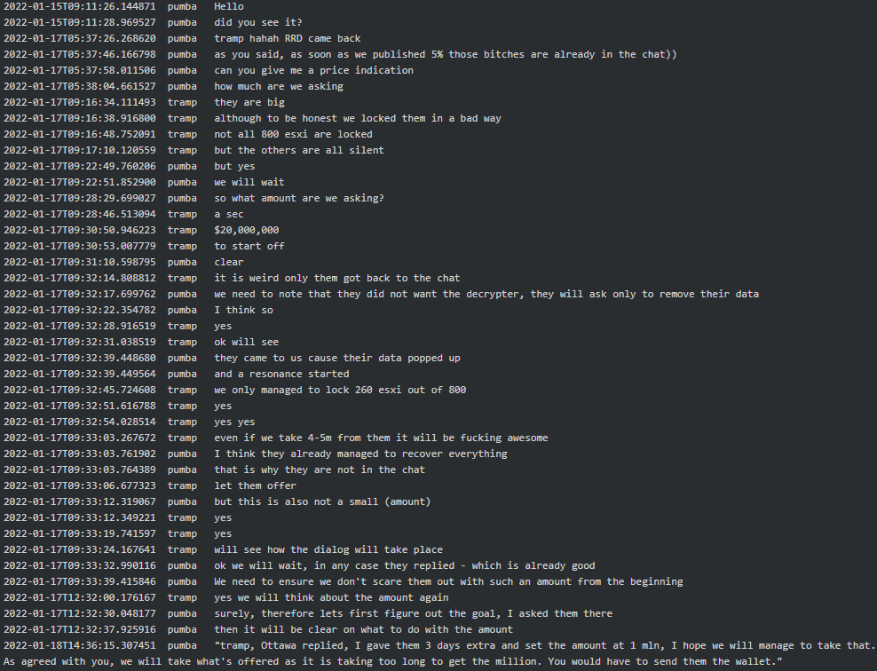Although the Linux variant’s first use on a potential victim (a large casino) dated as early as July 2021, we observed the ESXi variant becoming actively used only as of November 2021. By examining the Conti leaks we have identified some of the potential victims of Conti Linux variant across various industries including business, law, automobile, logistics, retail and financial services. Below is an excerpt from a hack case with the Linux variant, where initially Conti set a ransom at $20 million but settled at $1 million, mainly because something went wrong with the Linux variant lock and instead of 800 ESXi servers they managed to encrypt only 260 servers. Furthermore, it seems that the victim did not want Conti’s decryptor and Conti suspected they somehow managed to recover and restore their systems: