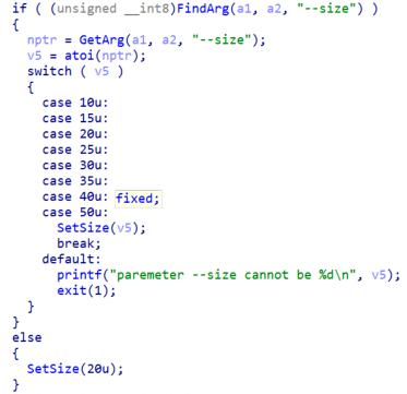 The second argument is “--file” which is parsed by the malware but not used in the code. The third argument is “--size” which is the partial size of the file that will be encrypted if the file is bigger than 5MB. It can only be 10, 15, 20, 25, 30, 35, 40 or 50.