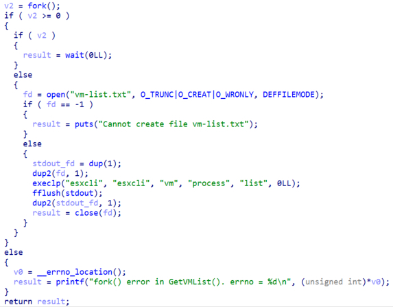 If the “--vmkiller" argument is passed to the command line, the malware will create a child process using the fork syscall and make the parent process wait till the execution of the child process finishes. The newly created process will create a file named “vm-list.txt”, redirect the stdout file descriptor to the file and finally execute the command “esxcli vm process list” via the execlp function.