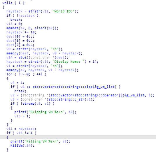The aforementioned command is used to list the virtual machines on the ESXi server and to obtain the necessary information to stop their execution. Next, the malware will read the file “vm-list.txt” created before and parse the world id and the display name. Before killing the machine, it will check if the name of the machine is in the exclusion list which the actors named “g_vm_list” and it was passed via the command line.