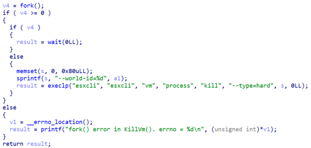 If the name of the machine is not found on the exclusion list, the malware will fork the current process and issue the command “esxcli vm process kill --type=hard --world-id={WORLD_ID}” to force its shutdown.