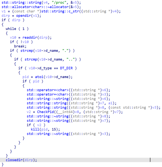 First, the malware will enumerate all the directories inside the directory “/proc” which contains information about processes and other system files. If the name of the directory is a number, which indicates is a directory that contains information about a running process, it will enumerate the file descriptors opened by that process in the CheckPid function and if one of the file descriptors matches the name passed to the function it will send a kill syscall to the process to liberate the opened file.