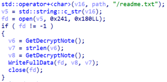 After, finishing execution of the virtual machines the malware will start enumerating the directory specified with the “--path” argument. First, the malware will create the ransom note on that directory with the name “readme.txt”. We will discuss its contents in the Ransom note section.