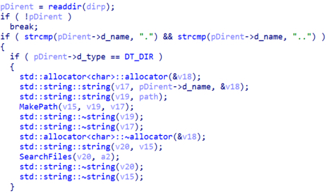 To traverse the directory, the malware will call the function “readdir” which returns a pointer to a dirent structure with the information of the directory. Conti will skip the directories ‘.’ and ‘..’ which corresponds to the drive current and parent directory. If the type of the entry of the dirent structure is “DT_DIR” which means it is a directory, it will recursively call the “SearchFiles” function to enumerate the files in the directory.
