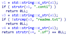 The “.conti” extension it is checked to not double encrypt files, the readme.txt filename is verified to not encrypt the ransom note file and the “.sf” extension is checked to not encrypt files related to the VMFS filesystem volumes used by VMware ESXi.
