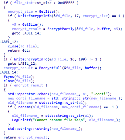 Based on the size of the file, the malware will encrypt it partially or fully and will rename the file with the “.conti” extension to mark the file as encrypted.