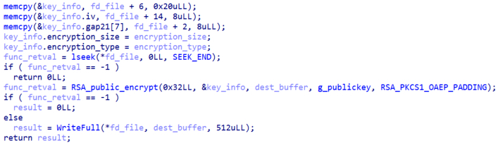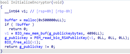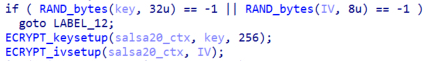 The malware uses Salsa20 as a symmetric algorithm to encrypt the files on the system by generating a random key and initialization vector using the “RAND_bytes” function of OpenSSL. For every file the malware is going to encrypt it will generate a new key and initialization vector.