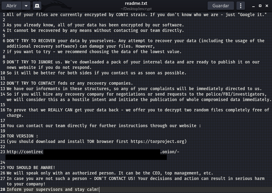 When a computer is infected by Conti, a ransom note with the name “readme.txt” is created in the path that was parsed from the command line. The ransom note is embedded inside the binary and it’s not encrypted in any form. An example is shown below: