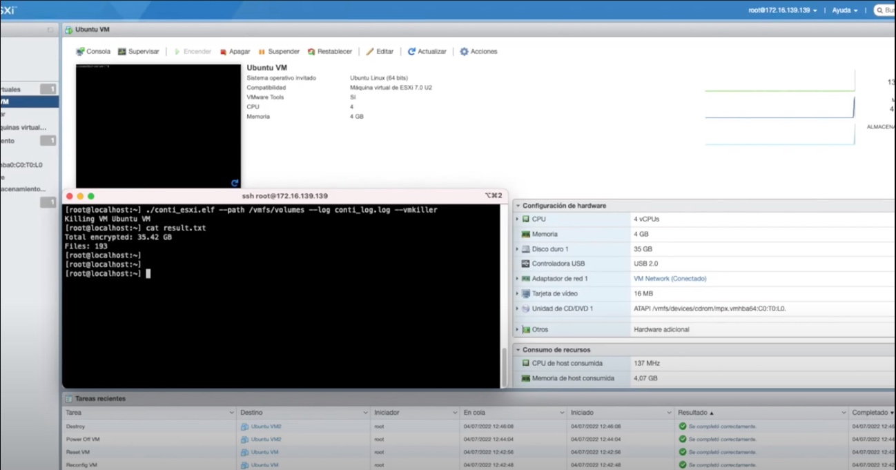 In the following link you can see a video of the encryption process of a ESXi server. First, the malware will stop the running virtual machine named Ubuntu VM and then encrypt all the files inside the path “/vmfs/volumes”. The result.txt file will contain the total encrypted size and the number of files encrypted and the conti_log.log file will contain the log messages of the malware.
