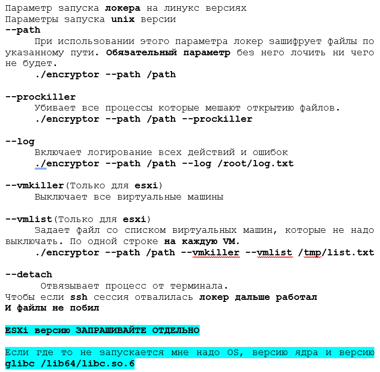 Moreover, Reshaev said the Linux locker does not launch on ESXi hypervisors with the version lower than 6.7 and for older ESXi versions, they need to re-build the locker with old libraries. This message in the Conti leaks of March 2022 is in line with the Conti playbook leak of August 2021 where one of the manuals highlighted in cyan that the Linux variant of the locker might not launch on certain OS versions: