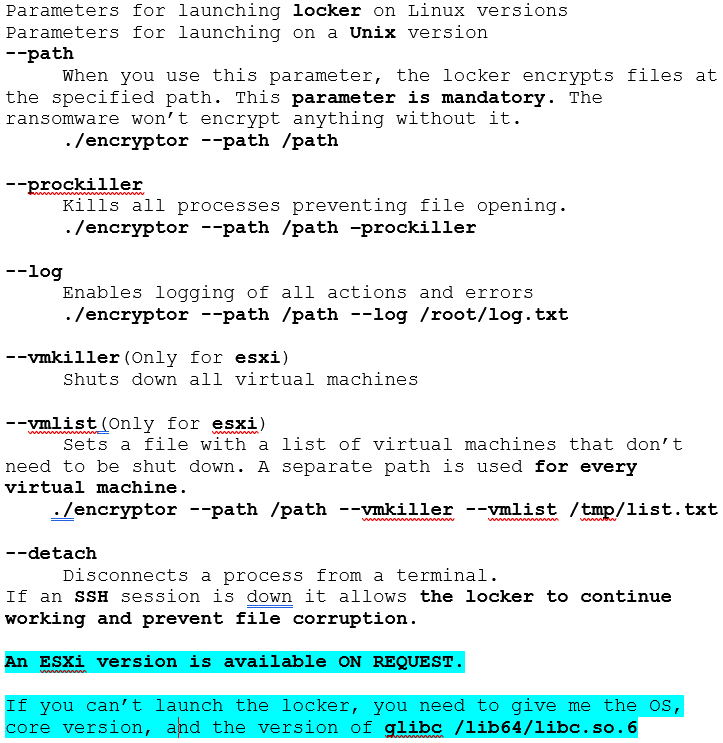 Because the argument “--path” is mandatory it seems that the malware was designed to be ran directly by the operators and not independently as the Windows version of the ransomware.