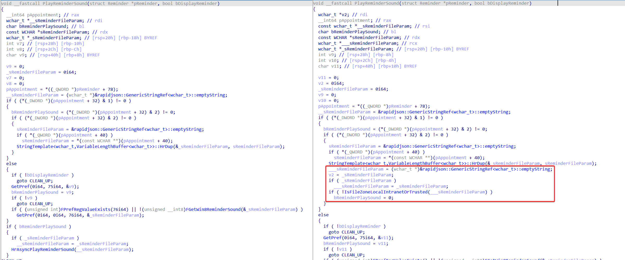 We can see that a block of code has been added in the patched version, highlighted in red, which calls the function IsFileZoneLocalIntranetOrTrusted on the ReminderFileParam. IsFileZoneLocalIntranetOrTrusted, as its name might suggest, simply checks whether the passed in file path is part of the device’s local intranet or in a trusted domain – returning 1 (true) if it is and 0 (false) it isn’t. Notably, if this check fails, the ReminderPlaySound flag is set to 0 (false), which causes the function to skip to the CLEAN_UP step and avoids invoking HrAsyncPlayReminderSound altogether, thus making the vulnerable code path unreachable if the provided ReminderFileParam is deemed unsafe.