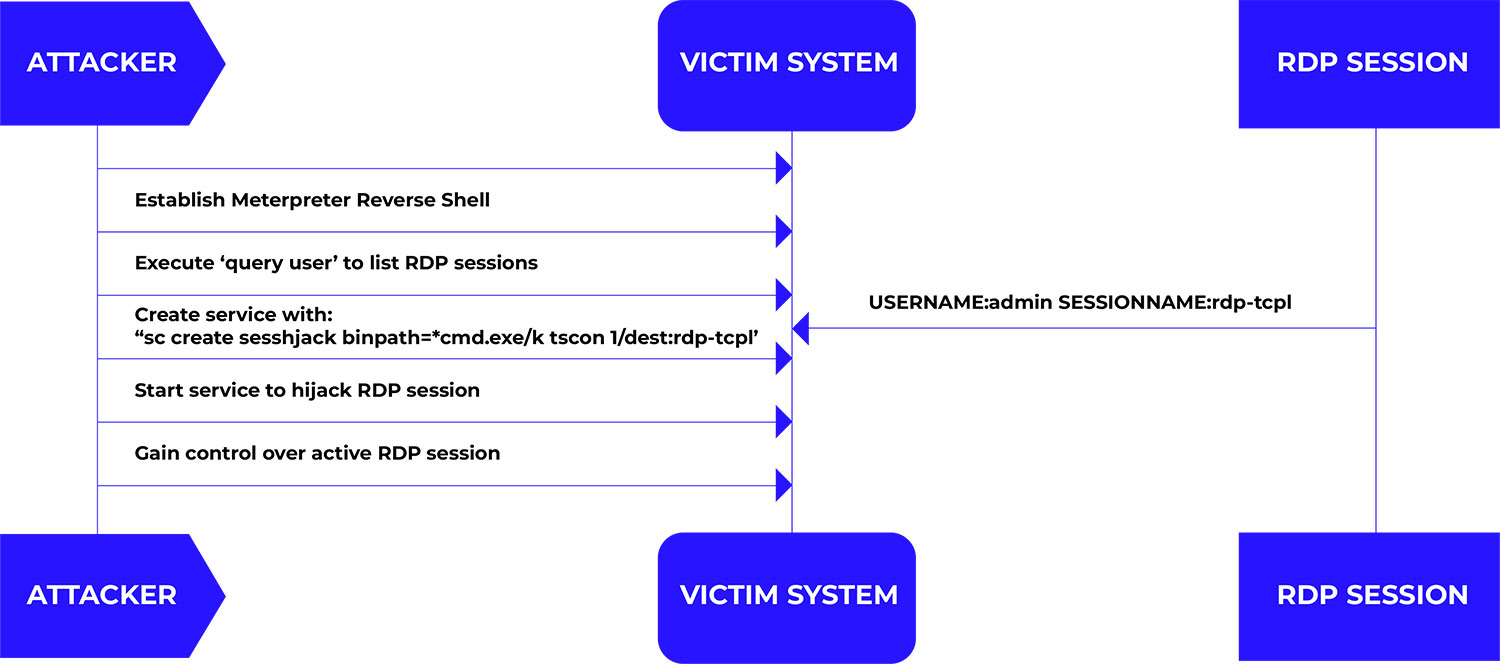 After creating the service, the attacker executes it, effectively hijacking the target RDP session. This method allows the attacker to assume control of the session without needing the user's credentials and without alerting the user. This technique has been documented as a means for attackers to hijack legitimate user sessions without authentication prompts.