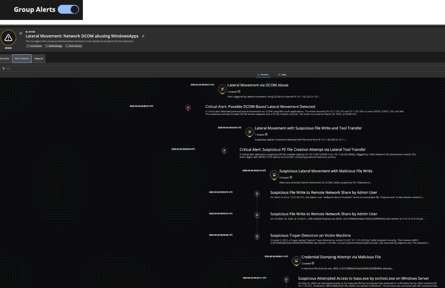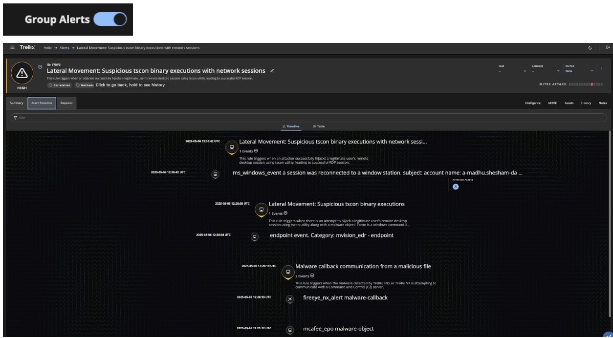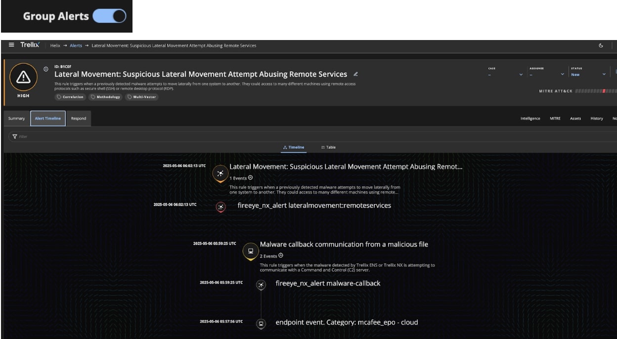 As attackers move laterally across the environment, Trellix Helix Connect surfaces atomic alerts aligned with each tactic or technique used. (An “atomic” alert is triggered by a single, specific, and discrete event or piece of data. Think of it as a highly focused alarm.) Security analysts can then enable the “Group Alerts” feature, which consolidates these signals into a single correlated alert, offering a clear, contextual narrative of the attacker’s movement, thereby enabling a rapid response to thwart the attack lifecycle.