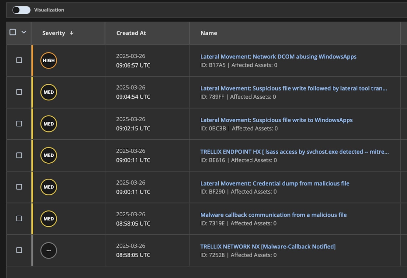 Below, figure (8) shows the alerts generated by the detection rules as the attacker traverses through their target’s network. The attack started with a network call back communication which was caught by the Trellix NX appliance. The attacker then dumped credentials before attempting to move laterally to a remote system by abusing a remote service.