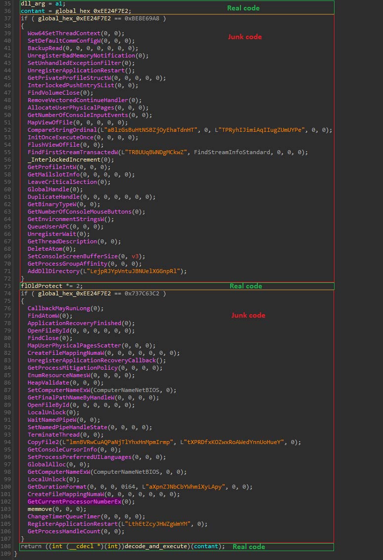 The second stage, the extracted DLL named “yvibiajwi.dll” is used to load and execute the third stage. This file contains junk code to hinder analysts.